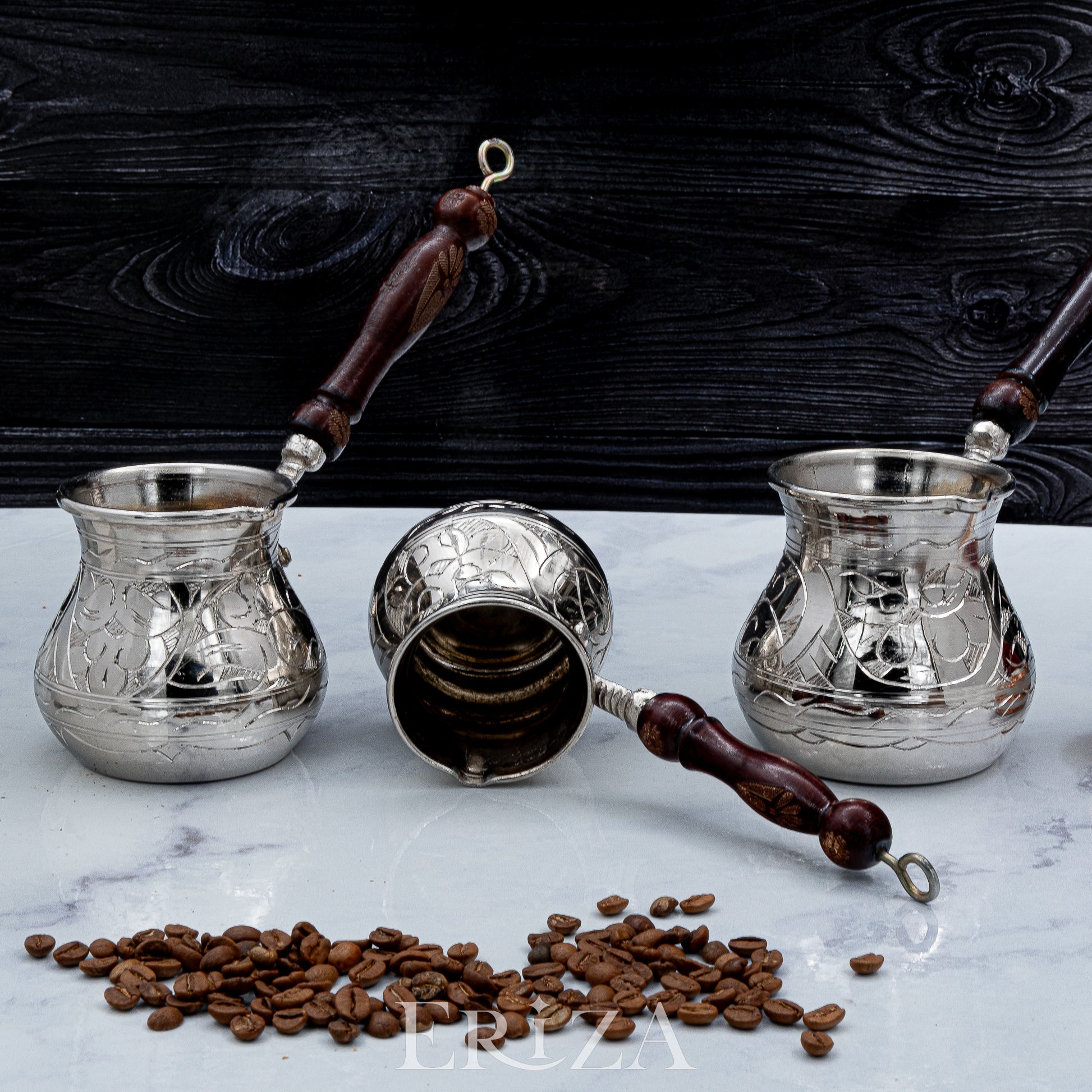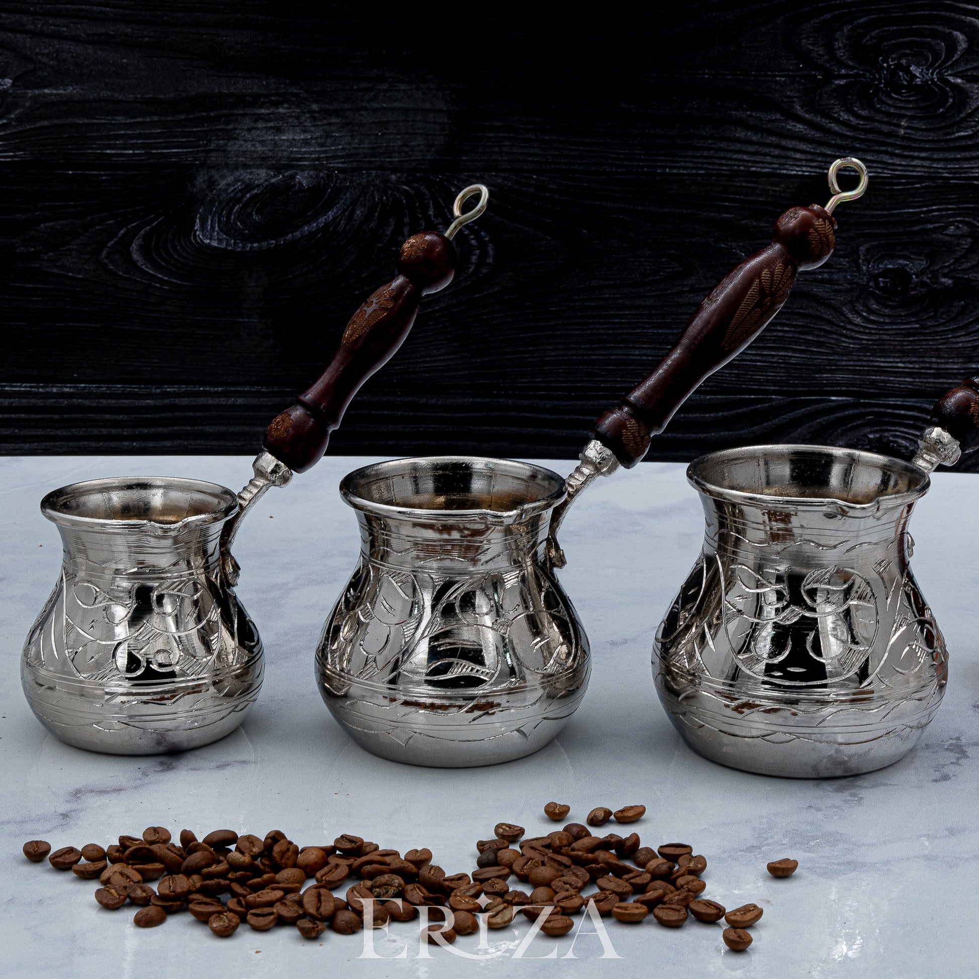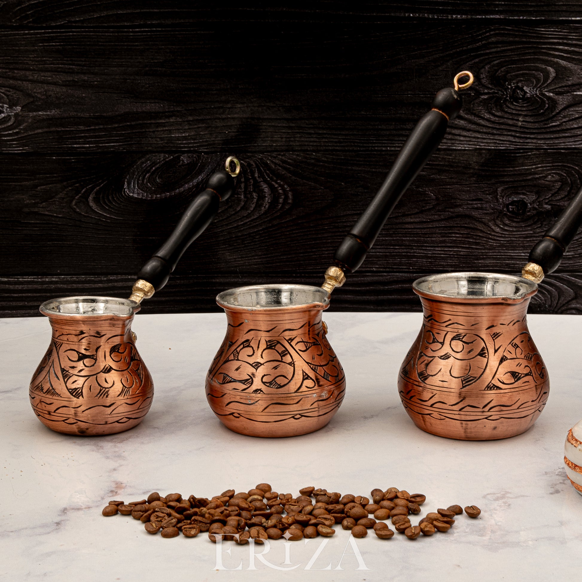 Geleneksel Gaziantep işçiliğiyle üretilmiş 3 boy cezve.